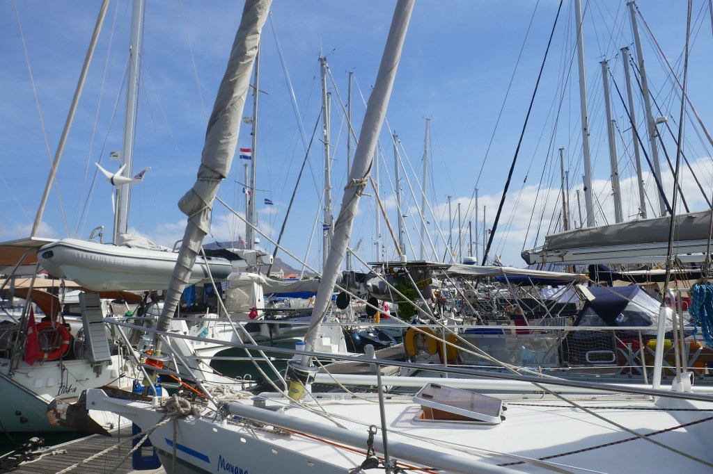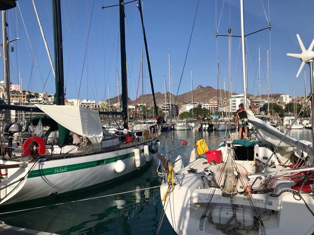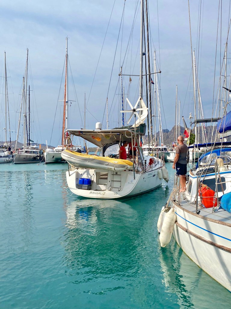 Le 13 Janvier à 10H locale, nous quittons la Marina de Mindelo en toute discrétion, avec un petit comité : nos deux voisins de ponton et un couple qui s’arrête au niveau de Mangaliz « Ca y est, c’est le grand départ ? ». En effet, Mindelo est la dernière étape avant la grande traversée de l’Atlantique, pour le Brésil ou les Caraïbes. La Marina ressemble à une véritable ruche, où tout le monde s’affaire : les équipages dans la préparation de leur bateau, les bateaux-stoppeurs en recherche d’une embarcation.