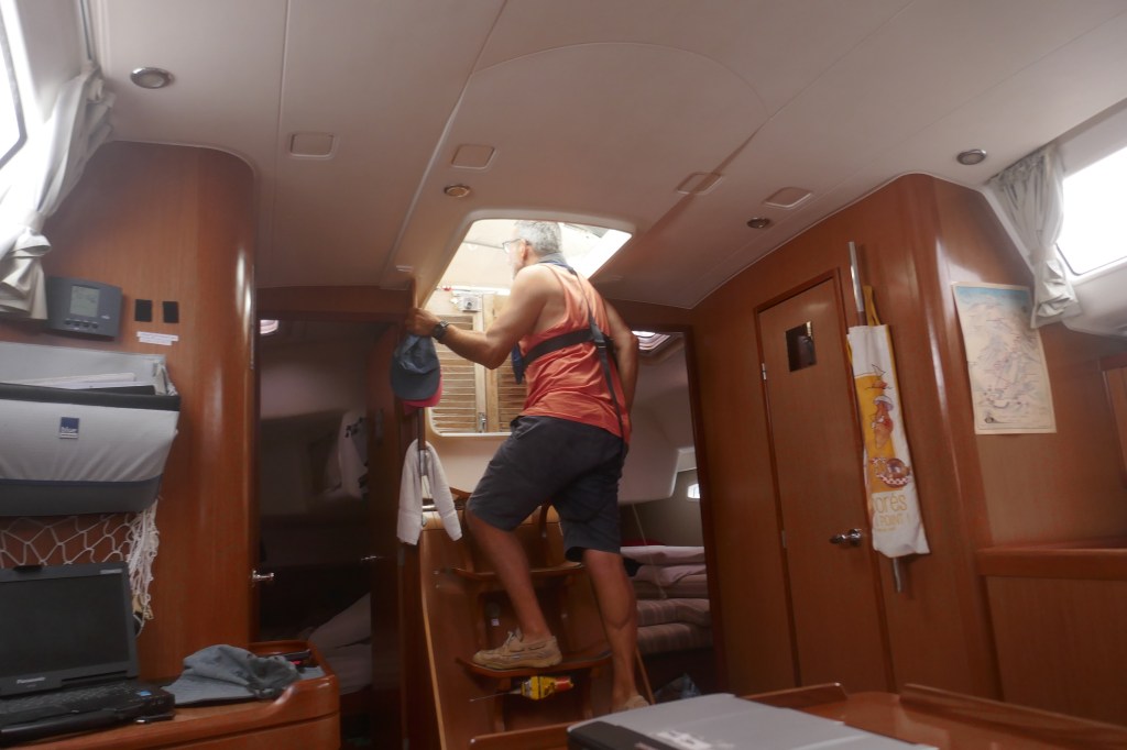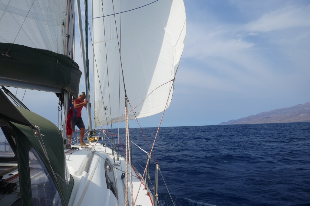 Va suivre la délicate opération de récupération du Spi. Sandrine à la barre, le Capitaine tente de l’affaler à l’ancienne, en ramenant le point d’écoute. L’eau commence à s’engouffrer dans le tissu, on chalute, c’est mal parti… Le Capitaine réussit à vider la poche d’eau, Sandrine choque le point d’amure et le Spi est ramené à bord. Mais le bord de chute du Spi s’est pris dans la barre de flèche, impossible de le redescendre. Sandrine loffe un grand coup, le Spi se dégage et on finit par le ranger dans son sac. Pour la suite de la Transat, le choix des voiles est désormais beaucoup plus simple (génois ou trinquette).