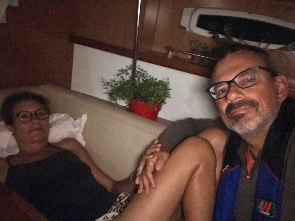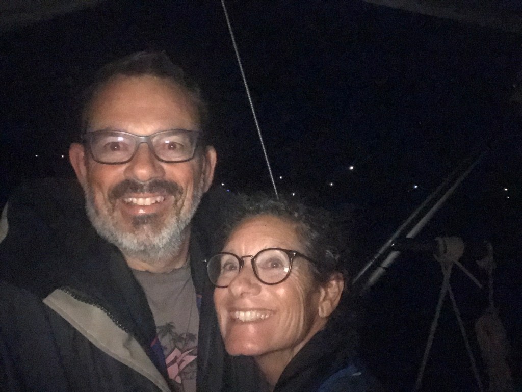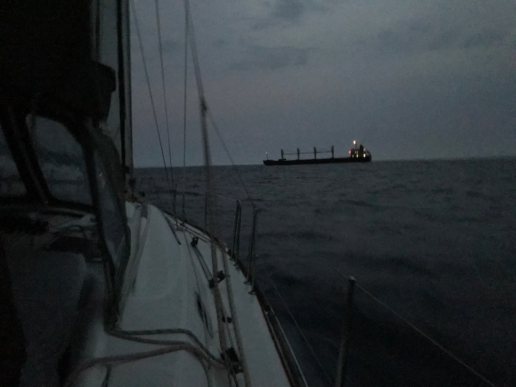 Dans la nuit, l’air se charge en humidité ; nous voyons de nombreux éclairs, accompagnés de coups de tonnerre, suffisamment loin pour ne pas être (trop) inquiétants. Puis, un premier grain anticipé grâce au radar – pas méchant, guère plus de vent et peu de pluie – comme une alerte qui nous est donnée, d’apprendre à gérer tous les prochains grains qui seront plus violents. Un deuxième cargo passe juste derrière nous (au final, on n’en verra que 4 autres à l’AIS sur toute la traversée). La nuit se termine tranquillement au largue, Grand Voile haute et Génois.