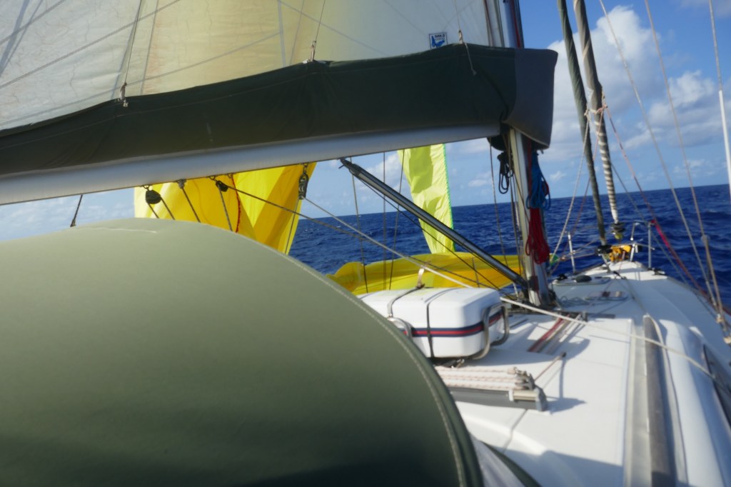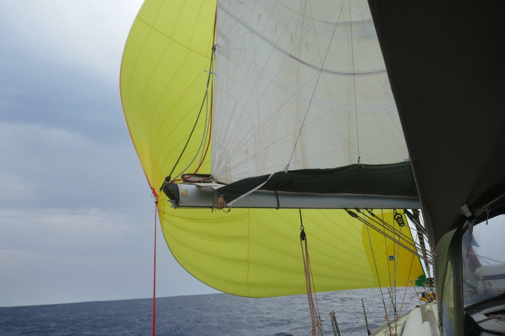 Au 4ème jour de navigation, le vent tourne NE et mollit un peu (14 à 17 noeuds). On ne voudrait pas faire baisser notre moyenne… Nous hissons le Spi (voile ronde à l’avant du bateau). Efficace, Mangaliz repart entre 7,5 et 8 nœuds pendant 3 heures. Ca glisse !