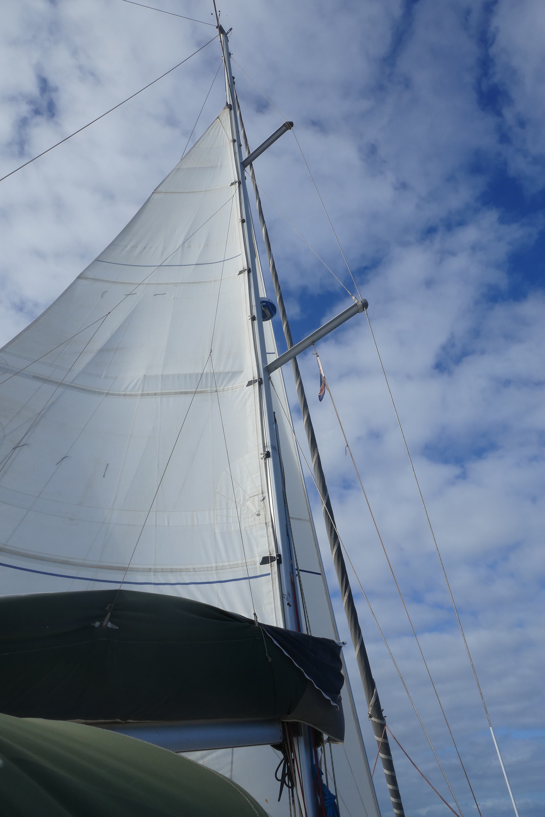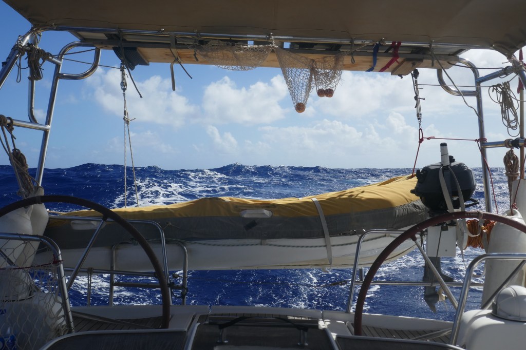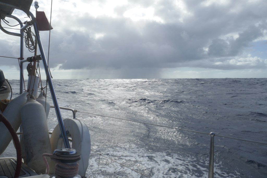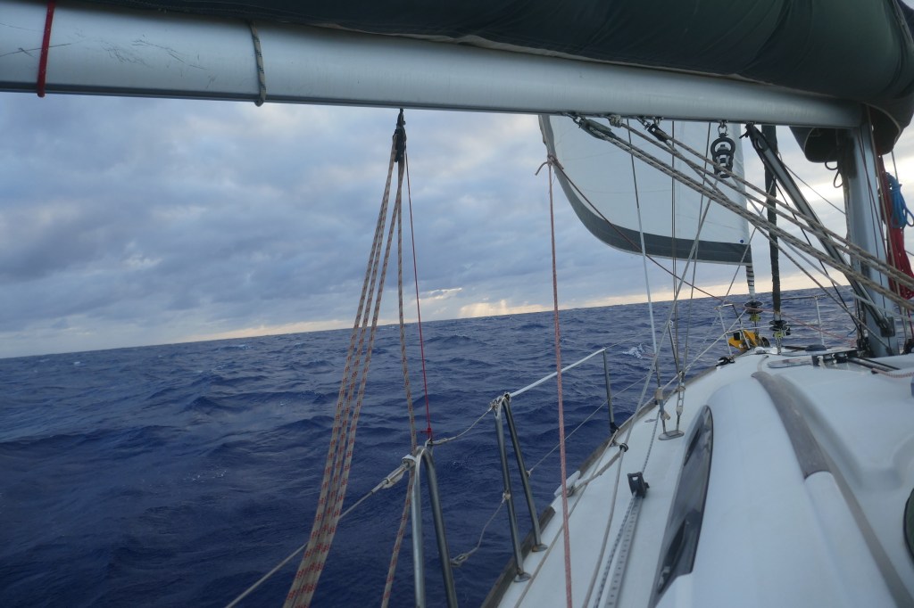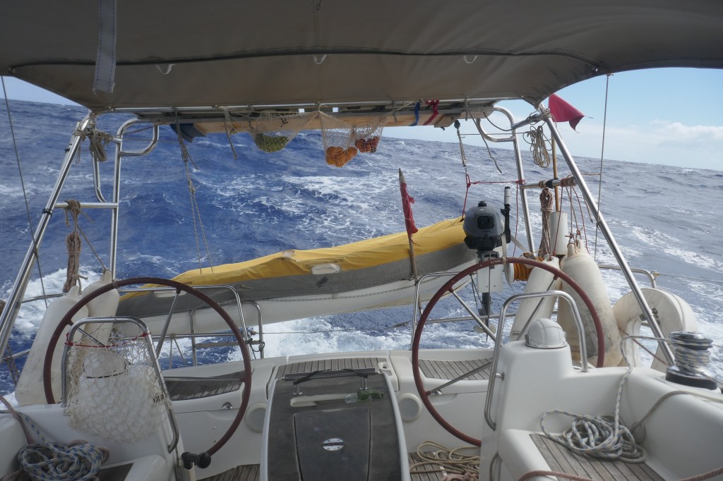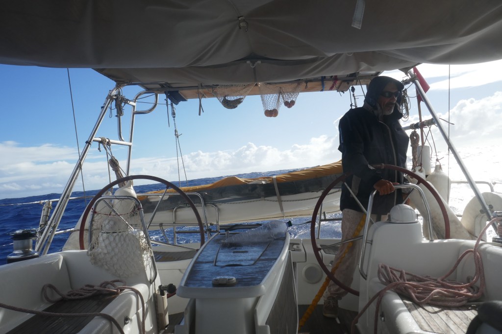 Pendant 2 jours, nous naviguons Grand Voile haute et Génois, avec un vent de NE entre 15 et 18 nœuds et une grosse houle désagréable.