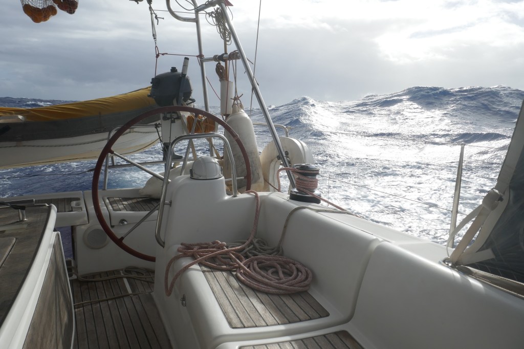 Durant les 3 jours qui suivent, on a entre 25 et 35 noeuds de vent, parfois 40 sous les grains, dans une mer très agitée, formée par une forte houle croisée (haute de 3 M) et assez courte.
