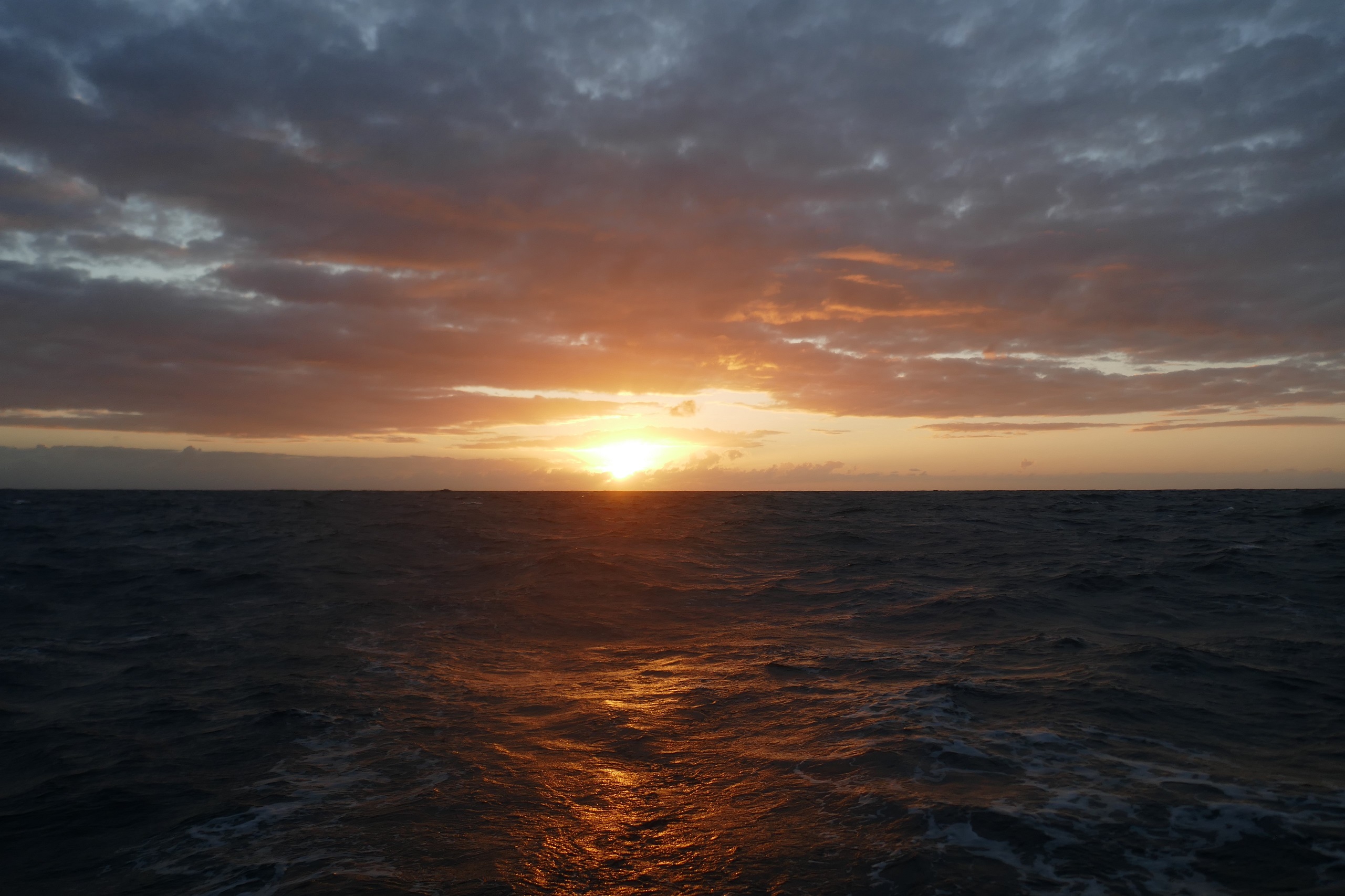 Comme lors de la traversée pour Madère, notre ami Jean-Jacques nous envoie quotidiennement des infos météo et des recommandations sur la route à suivre. Pour plus de facilités, les échanges se font à l’heure UTC. Au fil des miles, les levers et couchers de soleil se décalent; le dernier jour avant notre arrivée, le soleil se couchât à 23H UTC pour se lever à 10H UTC.
