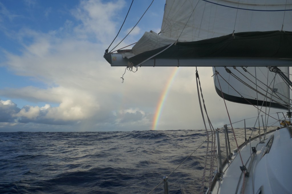 Le 10ème jour est LA journée de répit… et de repos. Ciel bleu (c’est bon pour le moral !) sans grain, vent établi autour de 21 noeuds, mer un peu mieux rangée. Nous ressortons la Grand Voile avec 2 ris, et filons à 7,5 nœuds (9 nœuds dans les surfs). Si cela pouvait durer !
