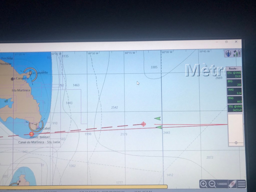 A 80 miles des côtes martiniquaises, après une douzaine de jours sur une mer désertique (sans bateau, ni oiseaux, ni mammifères marins, seuls quelques poissons volants trouvés régulièrement sur le pont), l’AIS nous signale la présence de 2 voiliers (portugais et anglais). On terminera la transat ensemble, sans se voir.