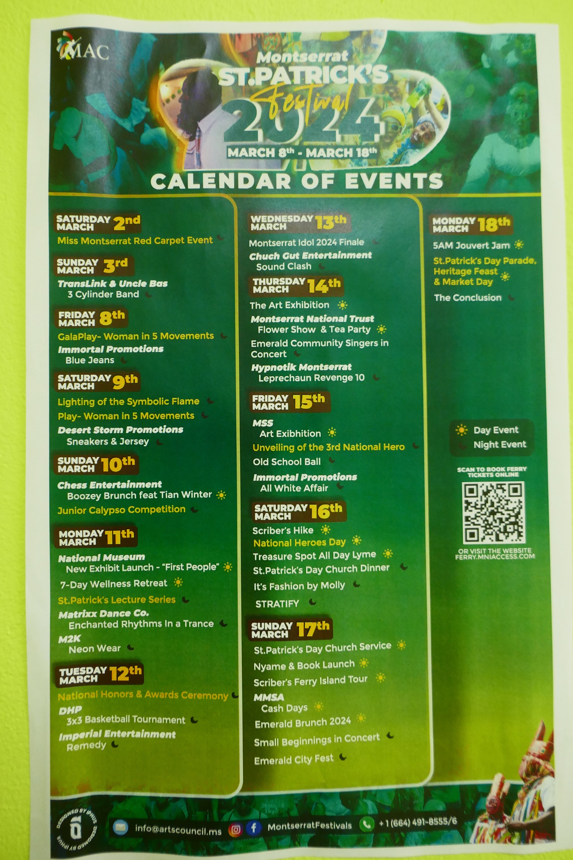 Aujourd’hui (après de nombreuses luttes entre colons Français et Anglais), Montserrat est un territoire d’outre mer de la Couronne Britannique, avec une emprunte Irlandaise ! Dès 1632, l’île devint le refuge d’Irlandais catholiques inquiétés par l’Angleterre. Etonnement, l’île célèbre la fête traditionnelle de la Saint-Patrick comme nulle part ailleurs, tout en rendant hommage aux esclaves qui se sont insurgés contre l’empire Britannique. Malheureusement, nous sommes arrivés 2 jours après cette grande fête annuelle – peut-être reviendrons-nous l’an prochain pour assister aux différents concerts, défilés… qui se déroulent pendant 15 jours.