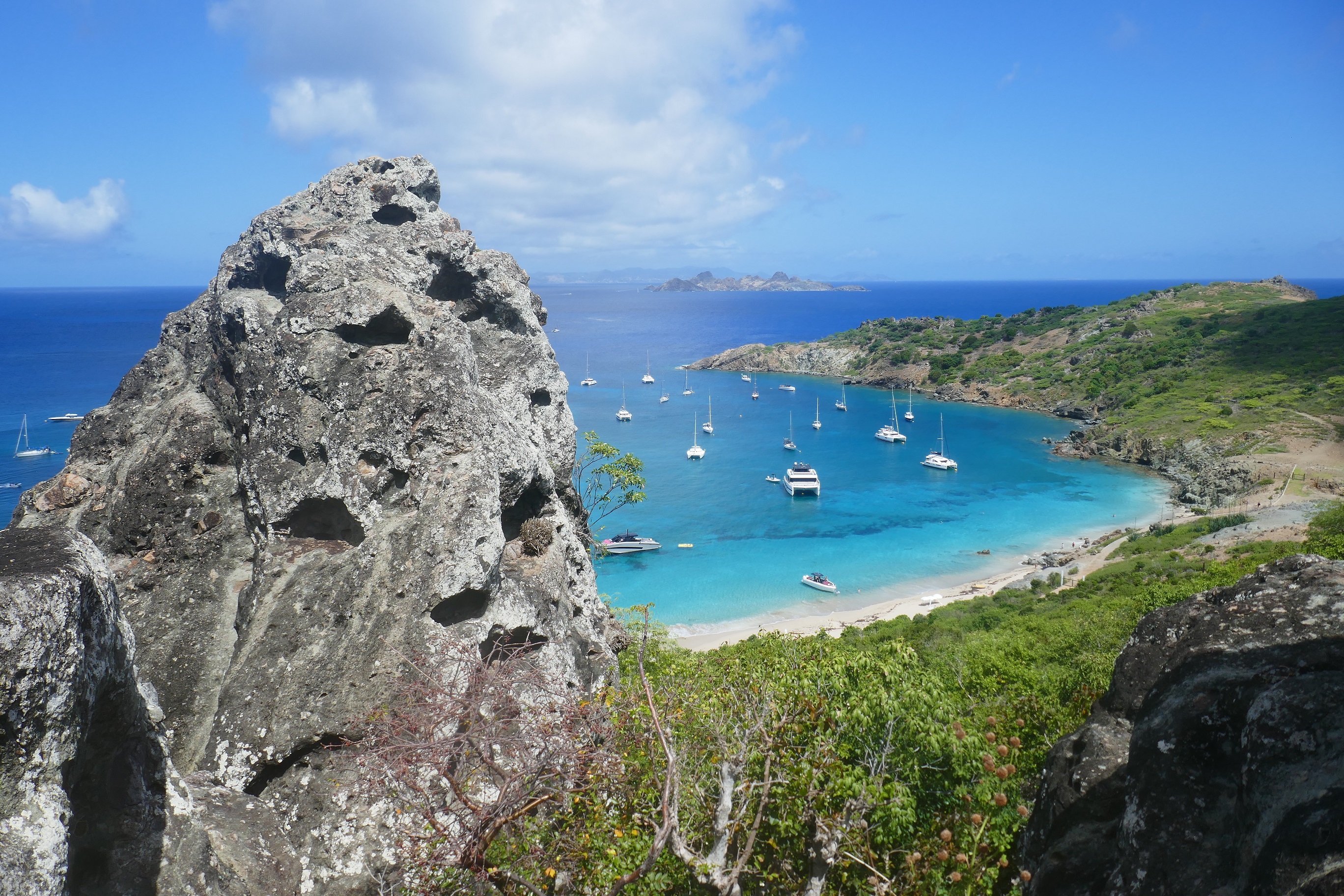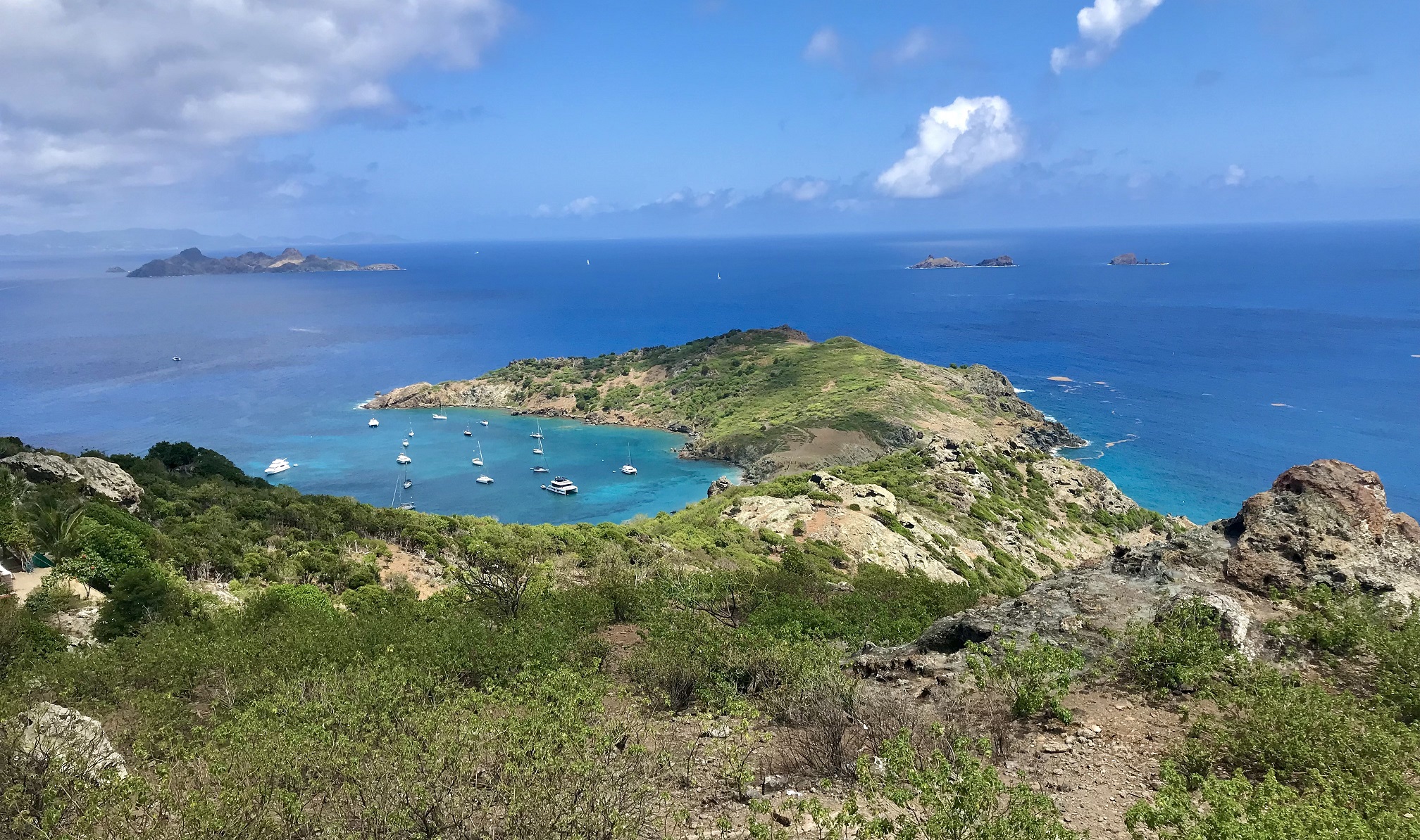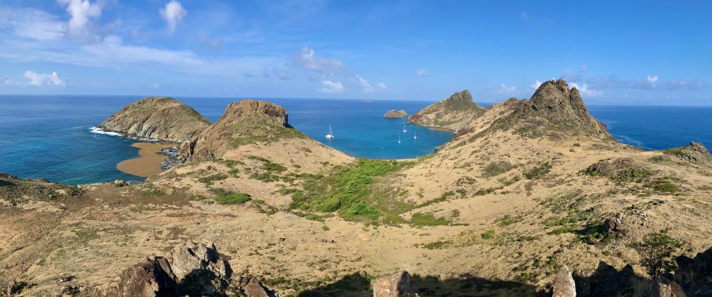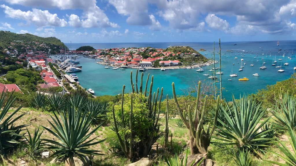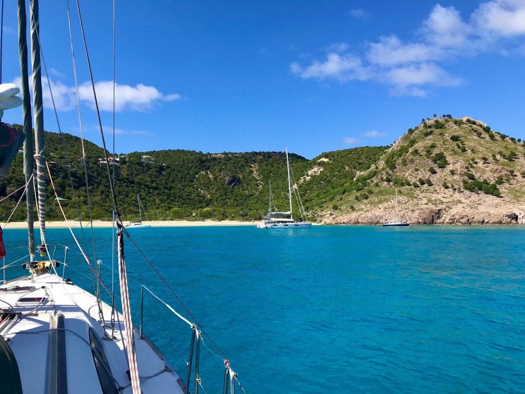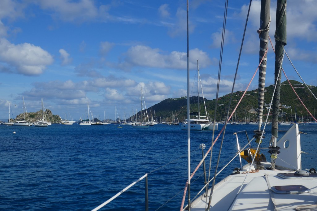 Cela faisait longtemps que nous n’avions pas navigué au prés serré (= vers le vent), avec un bateau à la gîte – allure bien moins confortable qu’au portant (= vent venant de l’arrière). Après 7 heures pour parcourir les 42 miles nautiques qui nous séparent de Saint-Kitts, nous arrivons à l’île de Saint-Barthélémy (Saint-Barth pour les branchés).