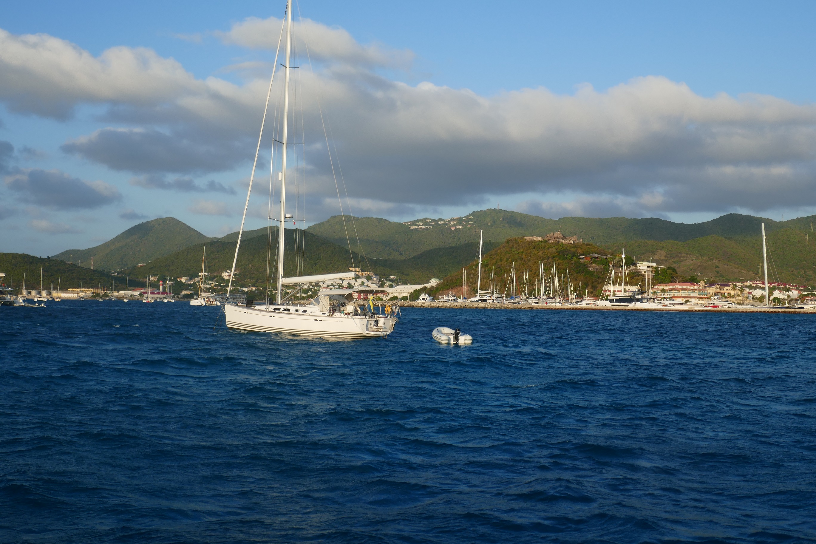 Anecdote au mouillage de Marigot : pour nous abriter d’un fort coup de vent et de la houle, on se déplace et posons l’ancre devant un champ de bouées. Après quoi, le personnel du port vient nous informer de l’interdiction de mettre l’ancre à cet endroit, pourtant bien plus abrité que la zone d’ancrage autorisée. Bref, nous prenons une bouée disponible pour les quelques jours qu’il nous reste ici. Le samedi matin, les mêmes employés viennent au bateau pour le paiement de la bouée. Alors que nous préparons de quoi régler, ils nous annoncent qu’ils ne sont pas habilités à encaisser, que le bureau se trouve de l’autre côté de la ville, et qu’il ferme à midi pour rouvrir le lundi matin ! Dommage pour eux, nous partons dimanche soir pour les BVI… Rien n’est vraiment fait pour que les plaisanciers aient envie de payer… Mangaliz, bateau pirate !