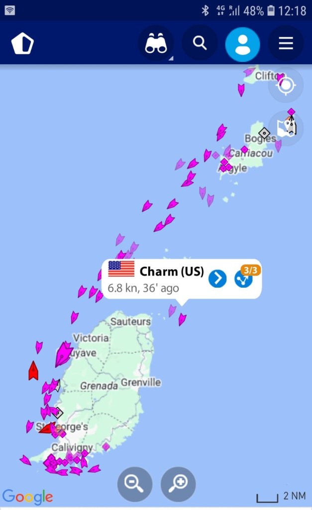 Finalement, nous décidons de favoriser plutôt les endroits que l’on connaît (Martinique ou Sainte-Lucie), plutôt que de partir à l’aventure dans le Sud des Antilles. Décision renforcée par le flux de bateaux qui descendent… Nous appelons la Marina de Rodney Bay à Sainte-Lucie, et sommes rassurés d’entendre qu’une place de ponton est possible pour Mangaliz (à défaut de place, nous serions remontés jusqu’en Martinique).