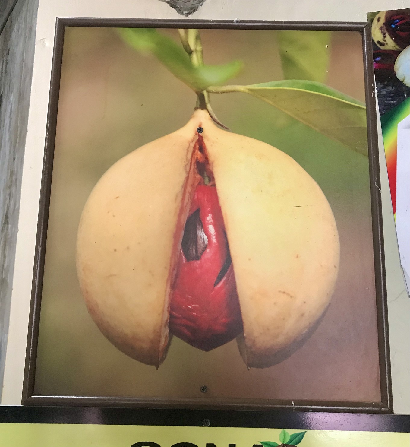 Celle-ci pousse sur le muscadier (haut de 10 à 15 M) et est ramassée lorsque le fruit commence à s’ouvrir. Tout y est récupéré.