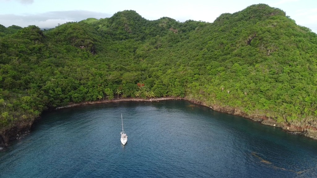 Après BEQUIA, continuant notre remontée vers le Nord, nous découvrons un mouillage sauvage sur l’île de SAINT-VINCENT : Petit Byahaut. Pas d’habitation, ni restau, ni bar. Juste le chant des oiseaux en journée, et le bruit des insectes dans une nuit noire sans lune. Un peu flippant !