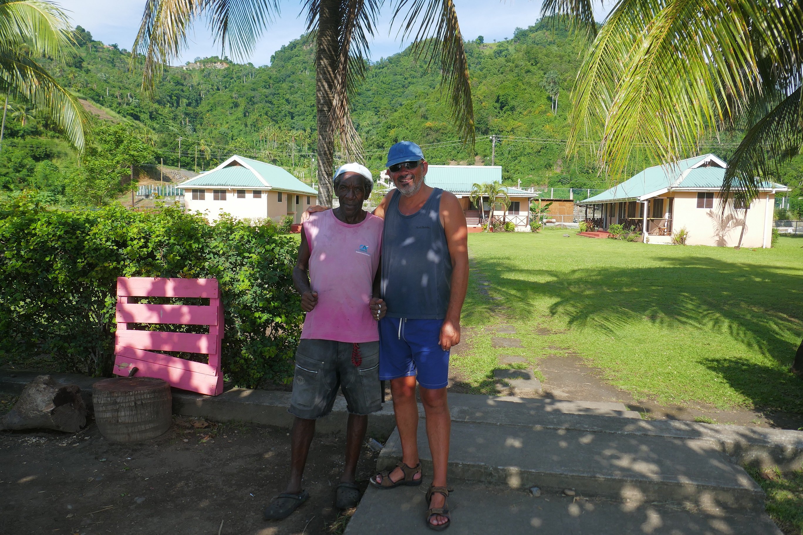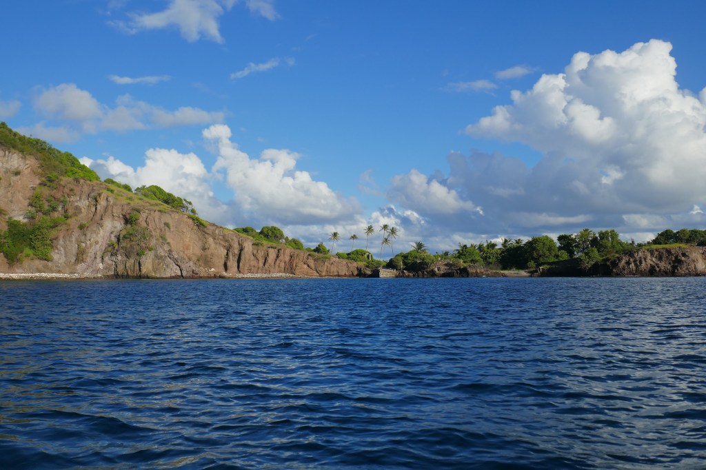 Re-formalités d’entrée pour Saint-Vincent-Et-Les-Grenadines, au bureau de Châteaubelair où les douaniers commencent à nous connaître ! puis une superbe escale dans l’étroite Baie de Cumberland. Par conséquent, le mouillage y est particulier : l’ancre à l’avant et l’amarre arrière entourée autour d’un cocotier, empêchent les bateaux de tourner. Au programme, chasse sous-marine, lecture, farniente, apéros… Le cochon grillé a été une grosse déception : on s’attendait à une bête bien dodue tourner autour d’une broche… on a trouvé des morceaux de cochon coupés n’importe comment à la machette et pas assez cuits. Nous ne sommes définitivement pas au pays de la gastronomie !