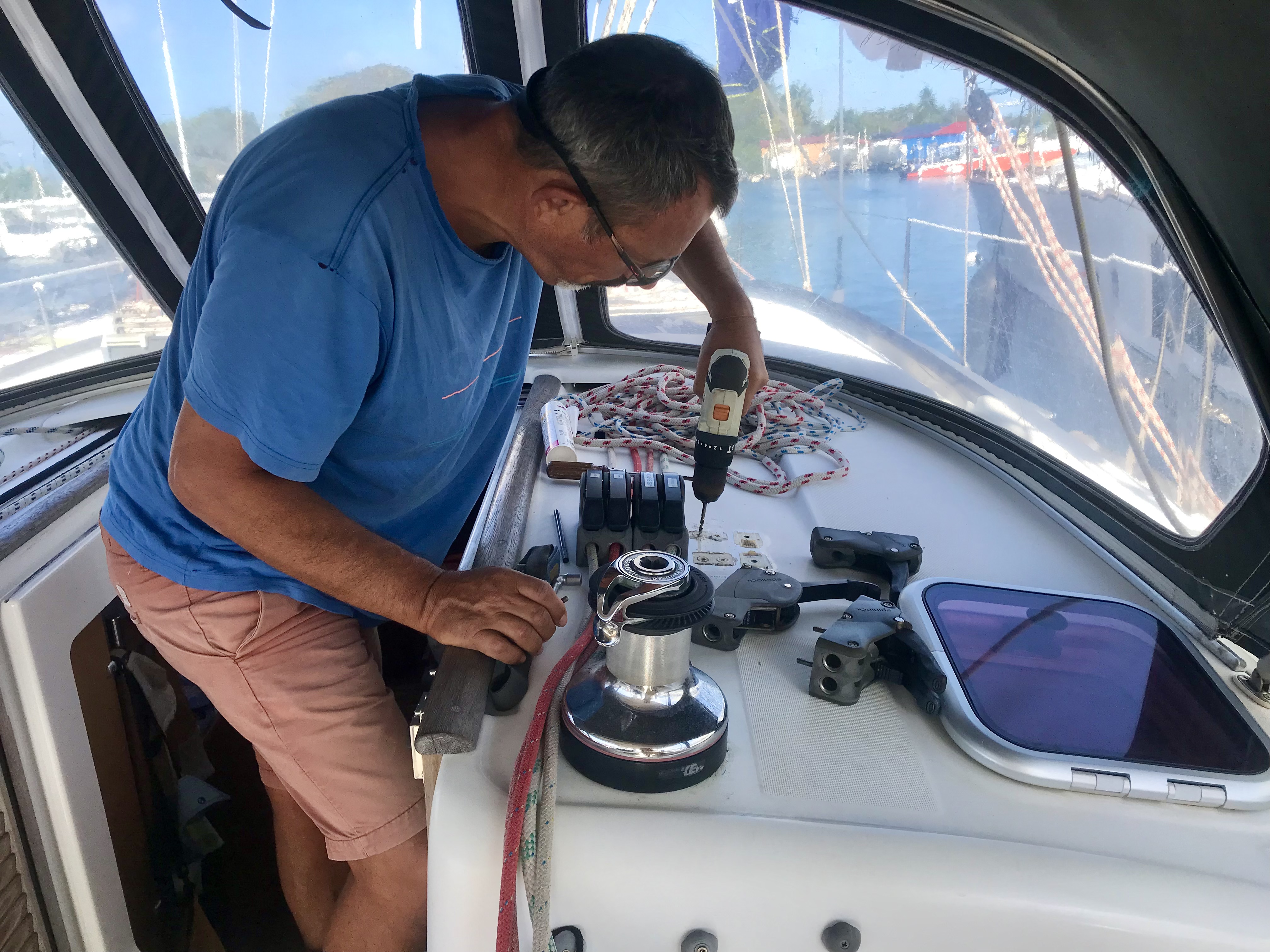 En attendant la sortie de l’eau de Mangaliz, nous commençons les travaux d’amélioration ou les petites réparations que nous avions listées pour la transat retour :