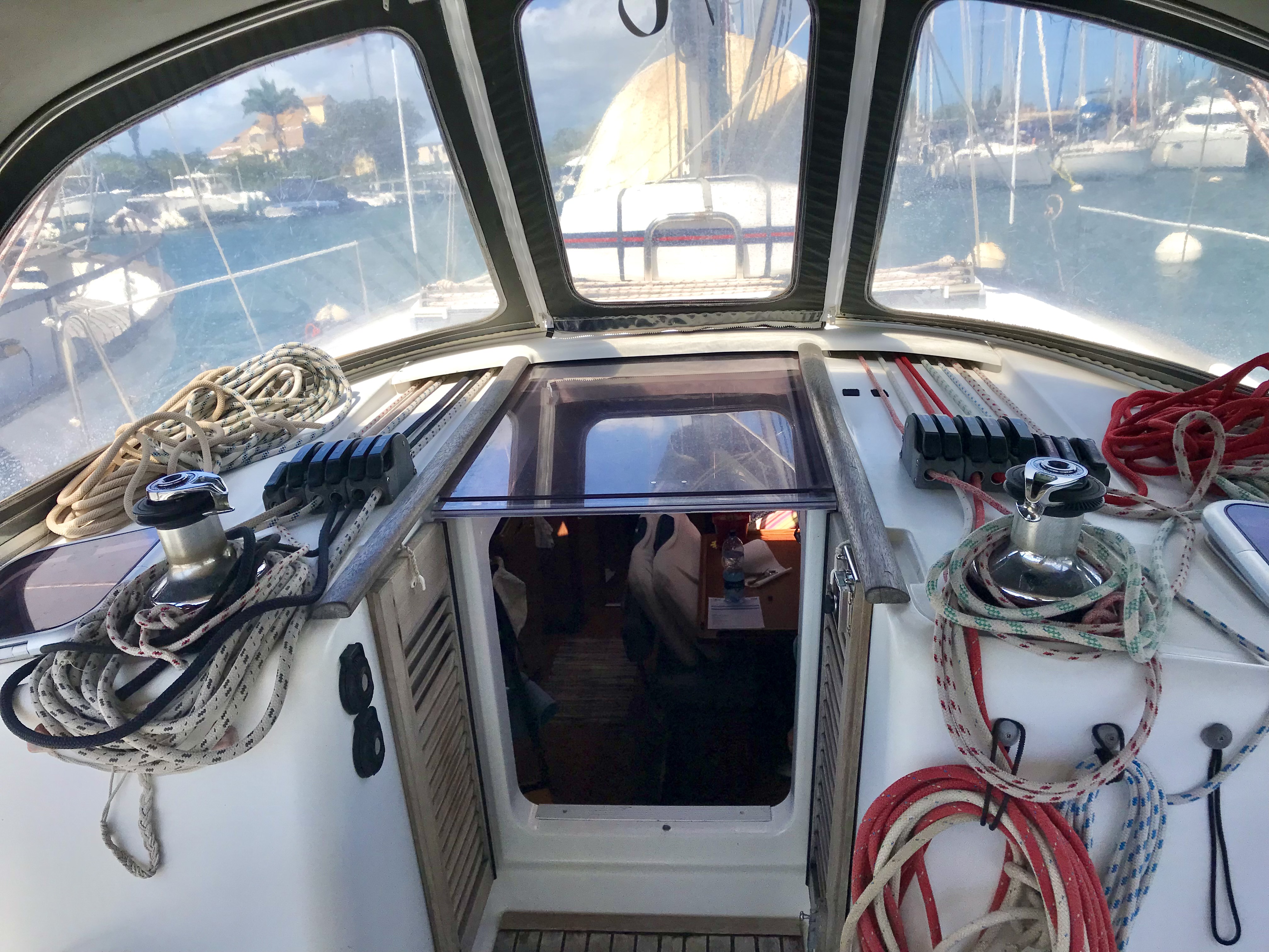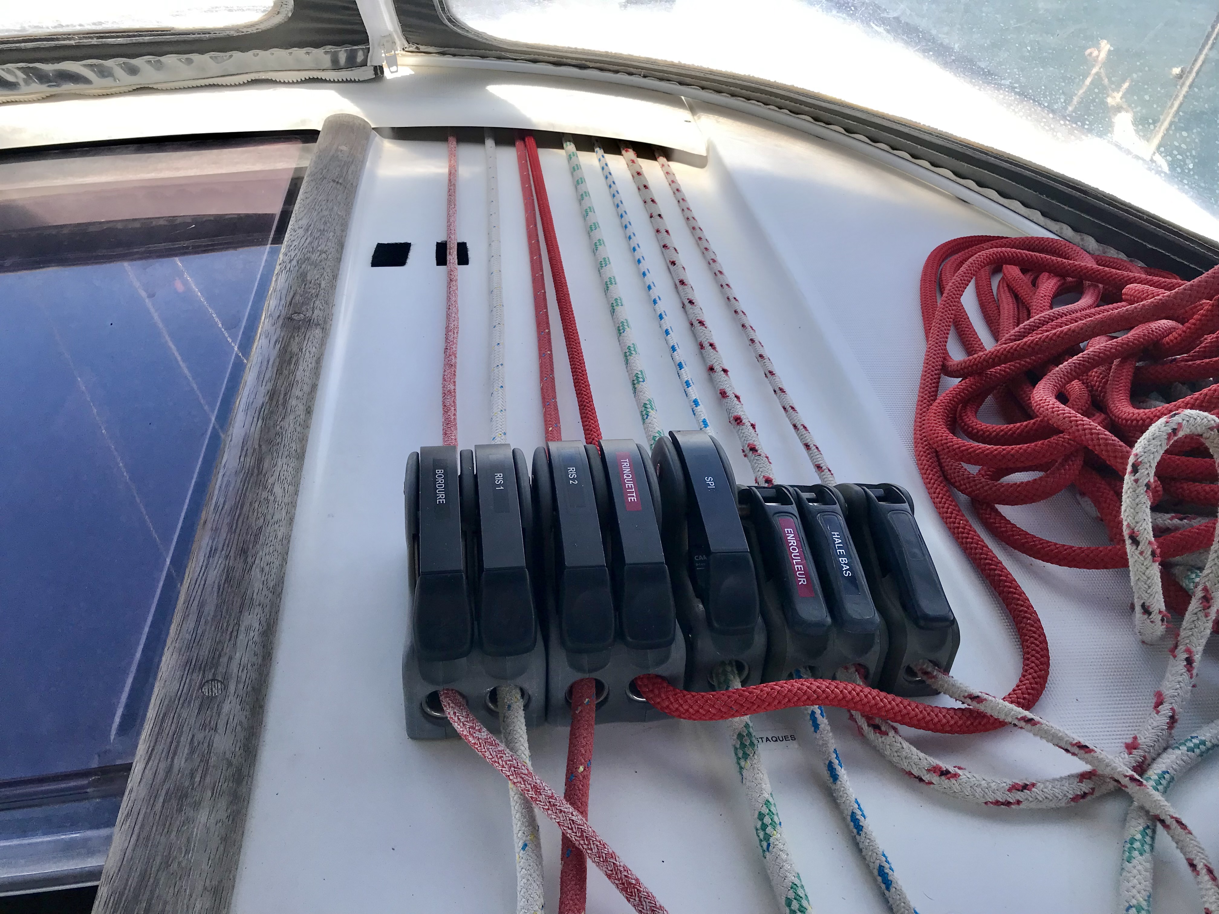 - installation de spinlocks supplémentaires pour prendre un 3ème ris (réduire la Grand Voile au maximum si vent très fort), et affaler le Génois ou la Trinquette en cas de problème technique : dorénavant, ces opérations pourront être faites du cockpit, sans prendre le risque d’aller au pied de mât
