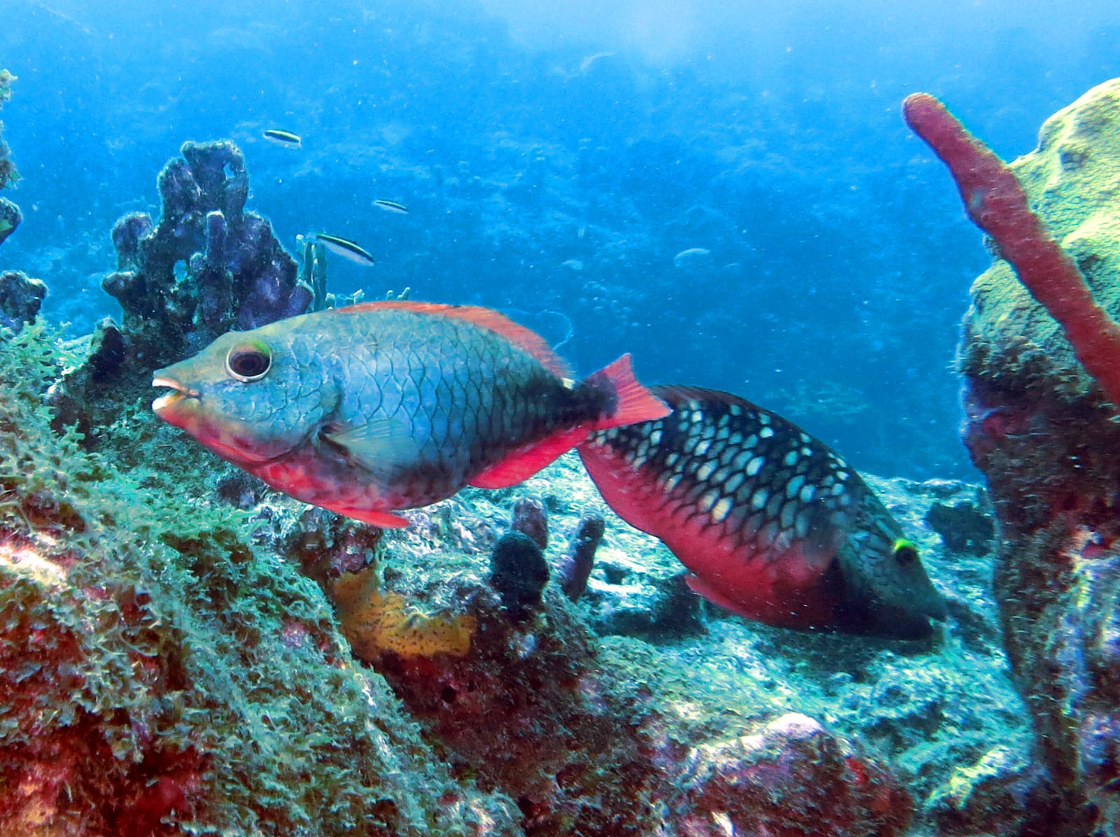 Pendant ces 3 semaines aux BVI, à défaut de randonner (peu de chemins existent), nous nous sommes adonnés à une autre activité favorite : la plongée en Palme-Masque-et-Tuba. Les eaux sont très poissonneuses, avec parfois de beaux reliefs sous-marins. Le Capitaine a troqué son fusil pour le lasso à langoustes (la ciguatera, une toxine très présente dans le Nord des Antilles, rend la consommation des poissons risquée).