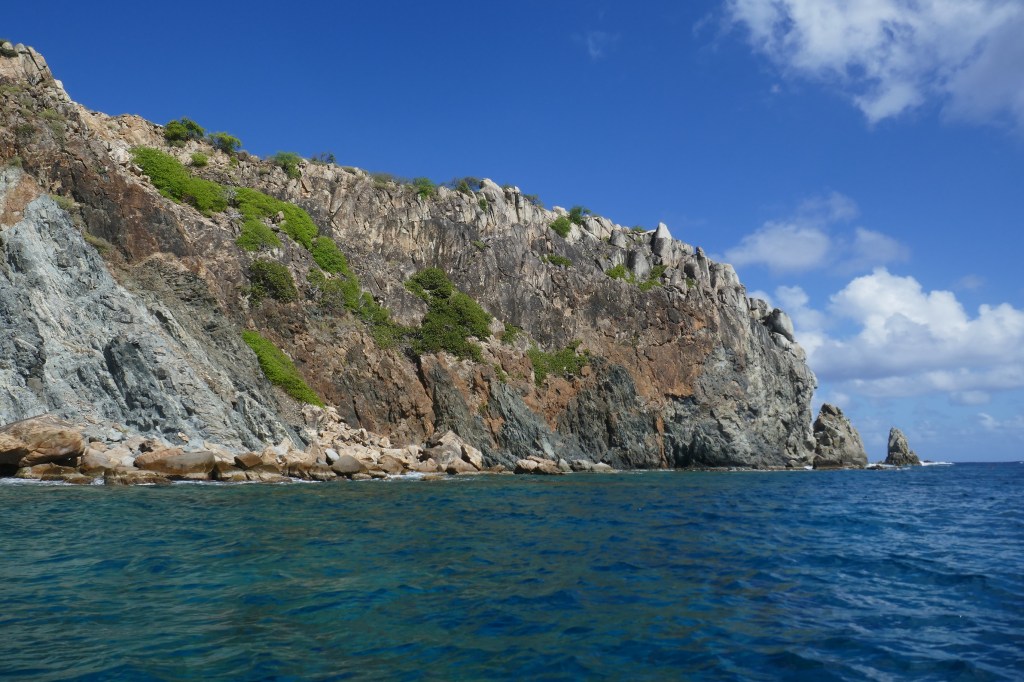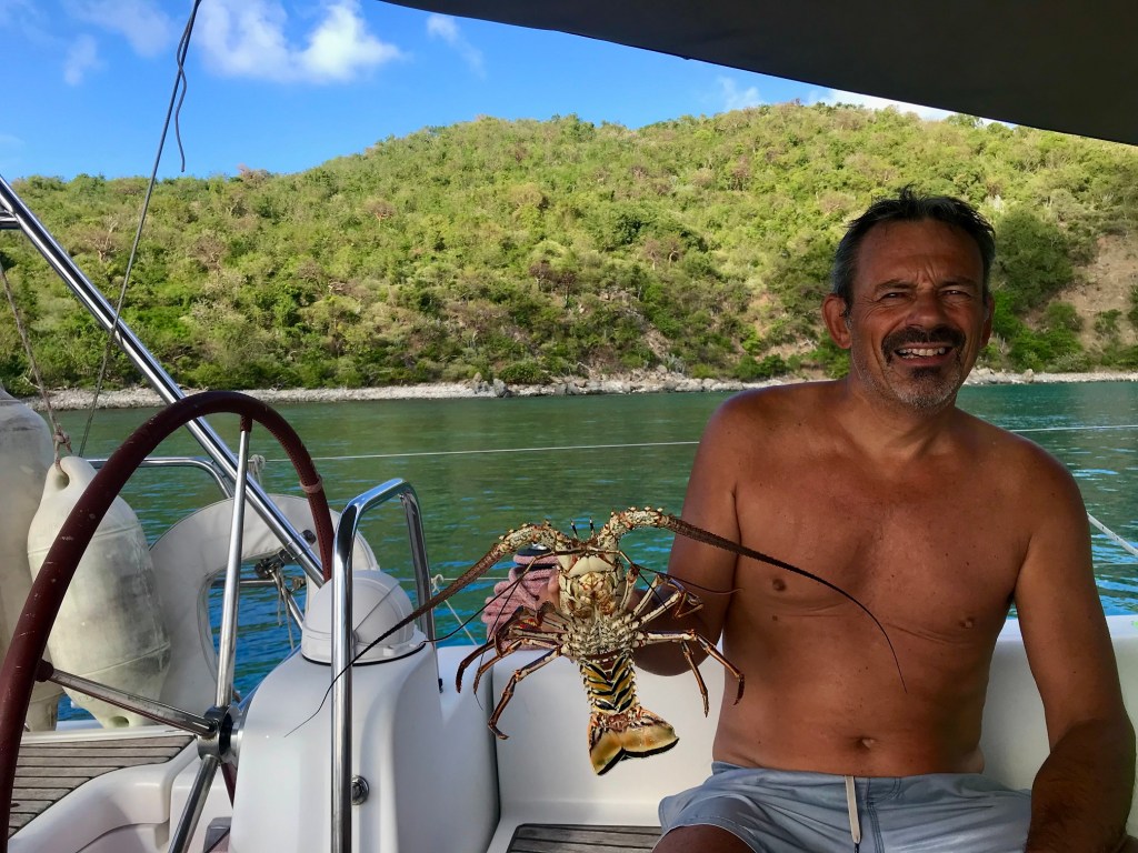 Après une nuit de navigation au départ de Saint-Martin (84 miles nautiques) avec le Génois seul (bords au portant), nous arrivons au petit matin à l’île de VIRGIN GORDA. Les formalités d’entrée attendront… priorité est donnée à la chasse à la langouste. Mission accomplie !