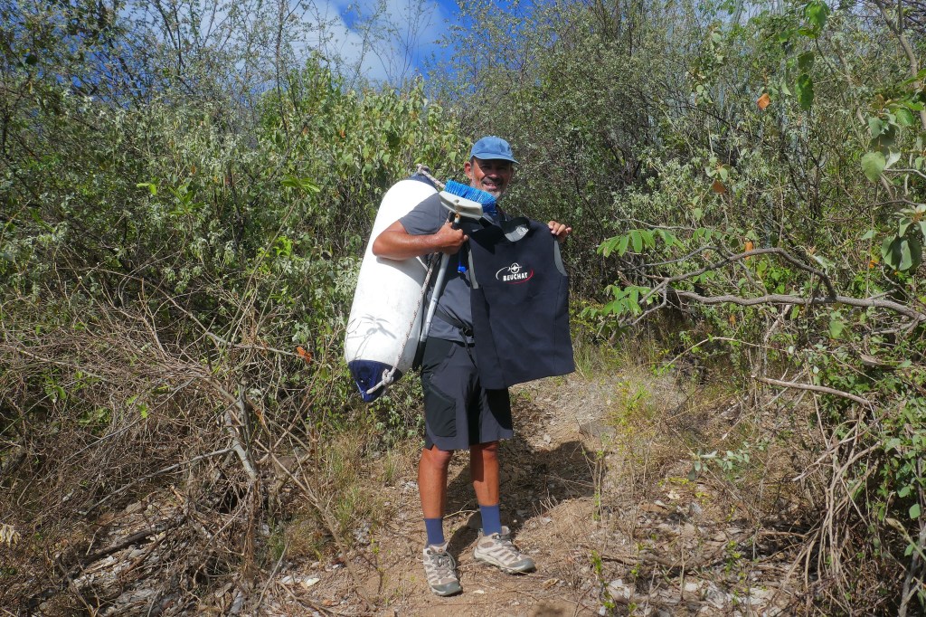 Le Capitaine récupère dans les laisses de mer ce qui peut être utile… pare-battage, top de plongée, balai brosse !