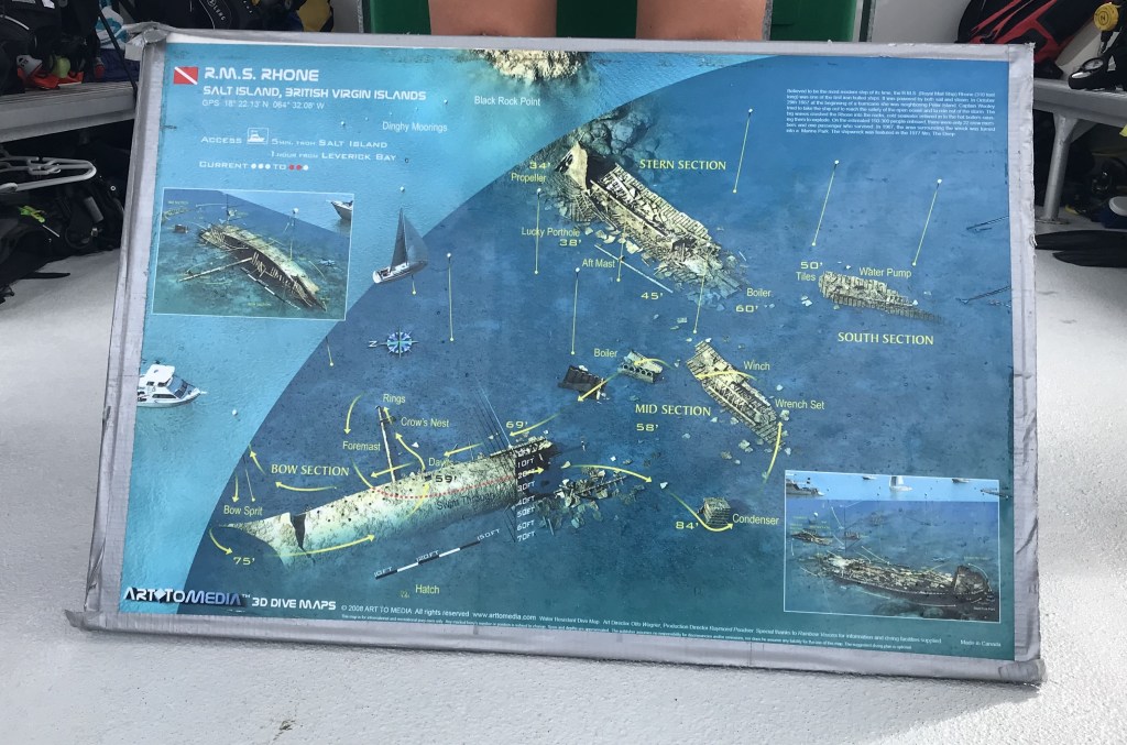 … et un club de plongée avec lequel nous allons explorer l’épave du RMS Rhône, à 25 M de profondeur (navire britannique qui fait naufrage en octobre 1867 dans un ouragan; son histoire incroyable est consultable sur internet). Toute sa coque en fer est recouverte de coraux et d’éponges, et est envahie de poissons. Une plongée multicolore !