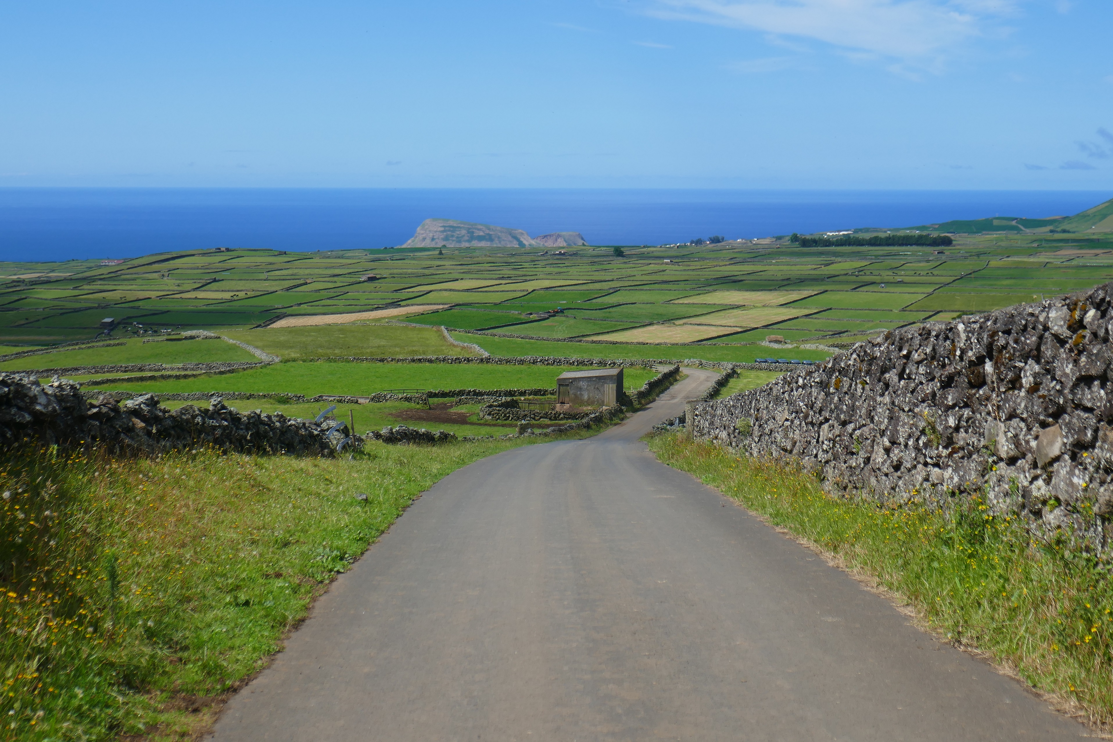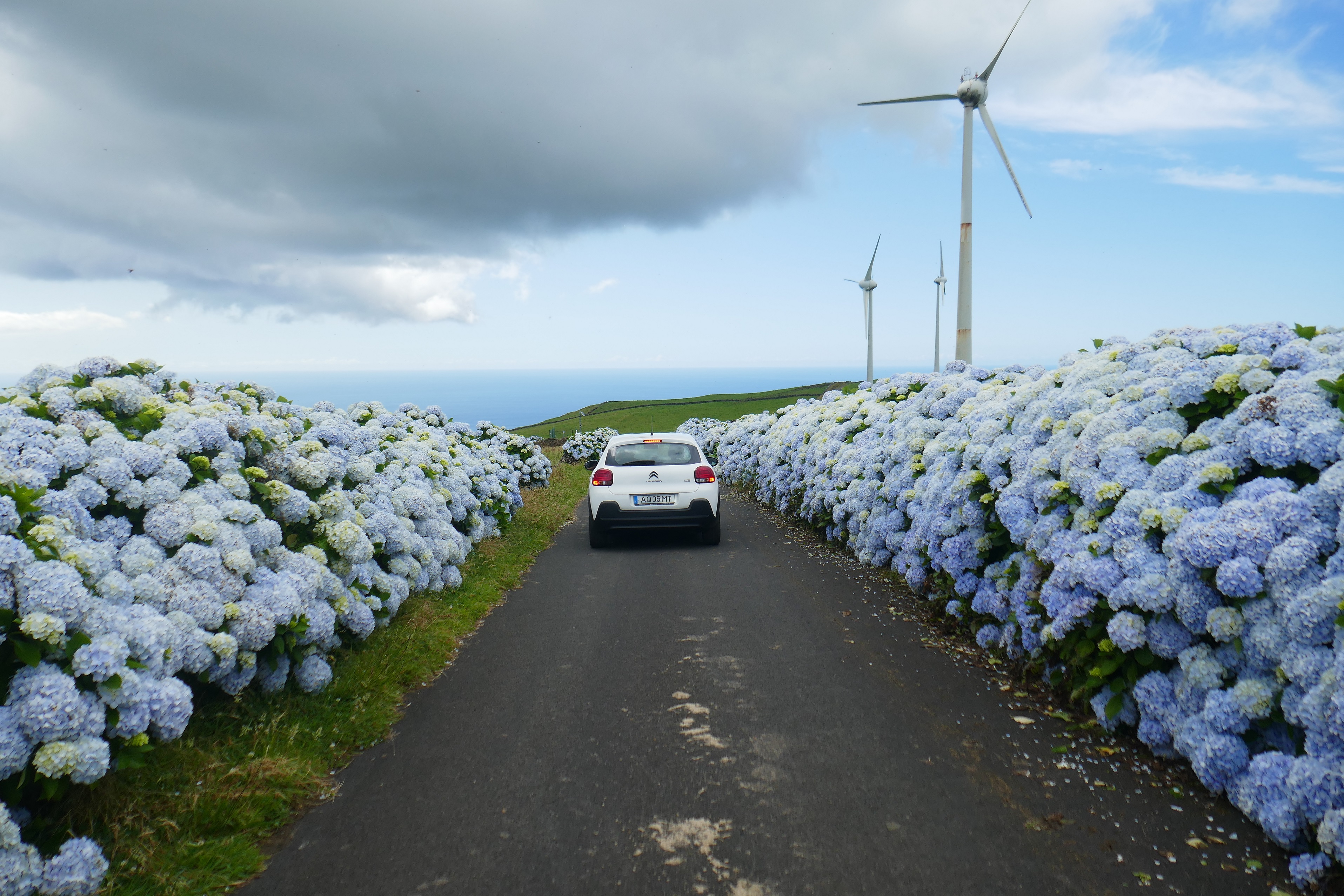 Terceira, belle et aussi verdoyante que les autres îles, est moins spectaculaire car plus ancienne. Mais les hortensias, énormes et omniprésents, ne cessent de nous envoûter.